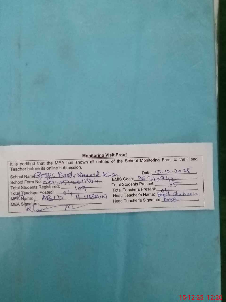 | Attendance Register | Head Teacher | MEA with School | Visit Proof |