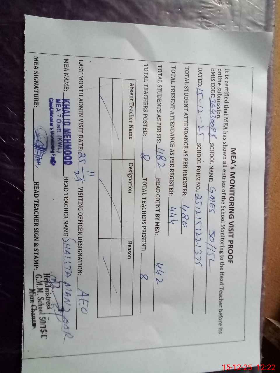 | Monitoring Date: 15-12-2025 | Start Time: 15-12-2025 11:35 AM | End Time: 15-12-2025 12:25 PM | Name of MEA: Kh**** Me**** | |
