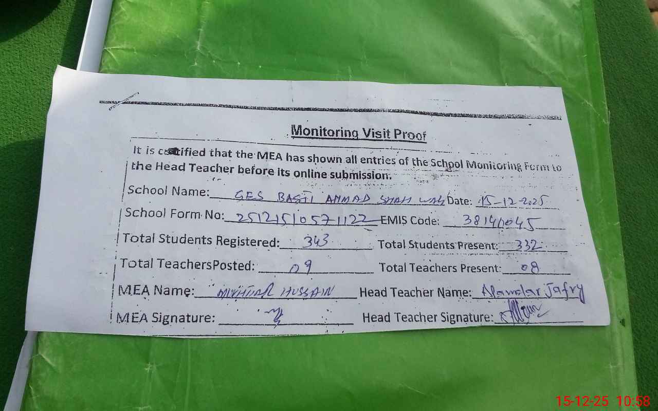 | EMIS Code: 38140045 | Name of School: GES BASTI AHMAD SHAH WALI | |||