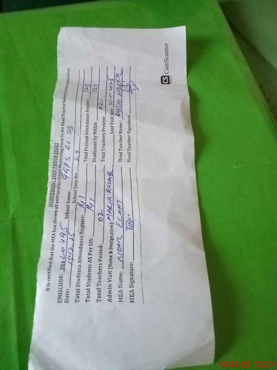 | Attendance Register | Head Teacher | MEA with School | Visit Proof |