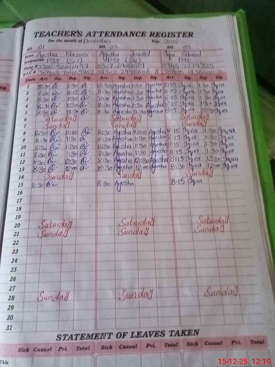 | CNIC | Full Name | Designation | R/C | Absence During Last Calender Month |