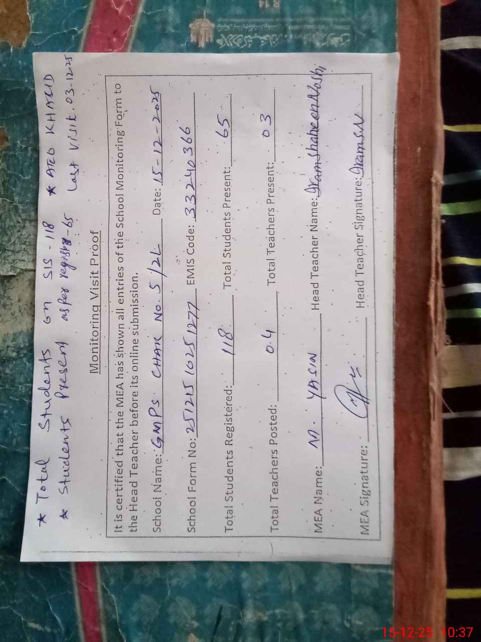 | Attendance Register | Head Teacher | MEA with School | Visit Proof |