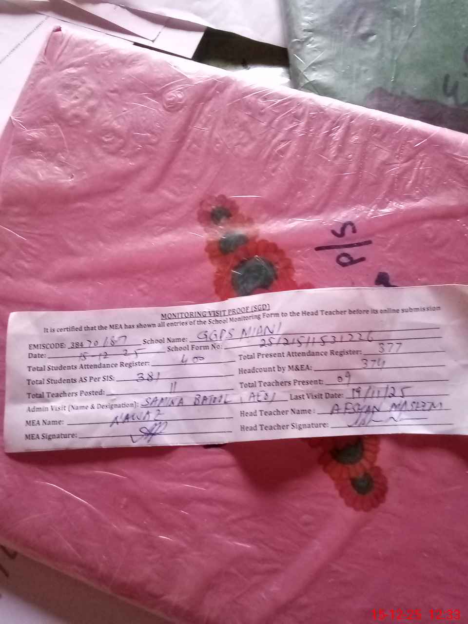 | Attendance Register | Head Teacher | MEA with School | Visit Proof |
