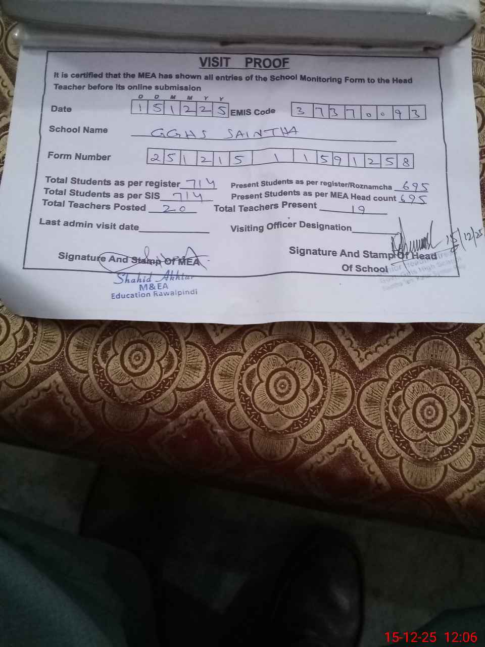 | Attendance Register | Head Teacher | MEA with School | Visit Proof |