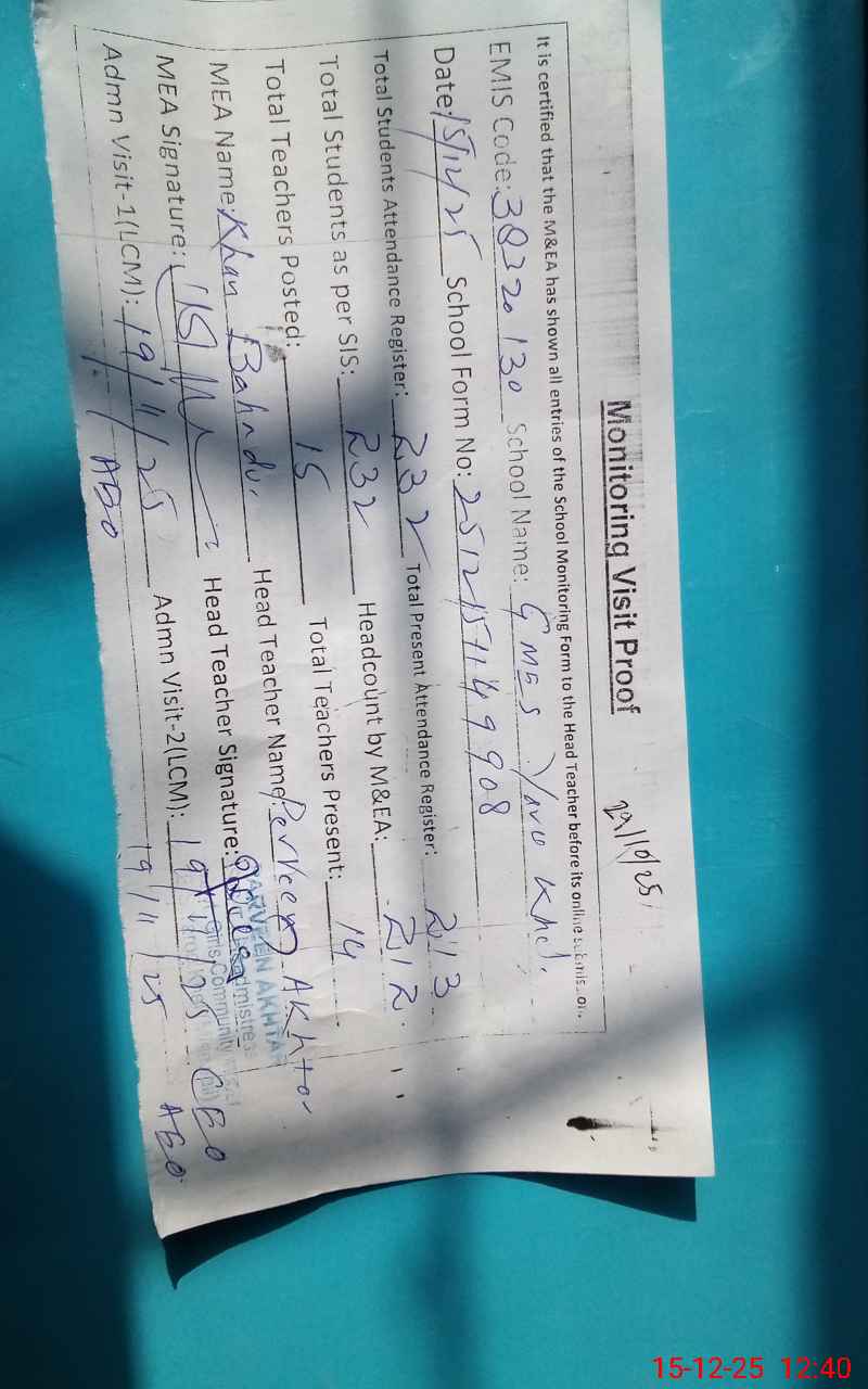 | EMIS Code: 38320130 | Name of School: GMES YAROO KHEL | |||