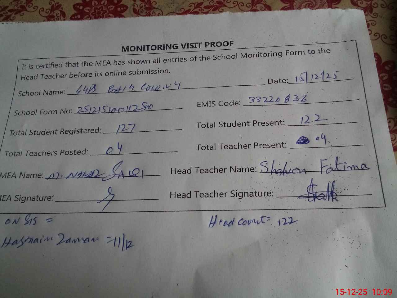 | EMIS Code: 33220836 | Name of School: GGPS BAIG COLONY | |||