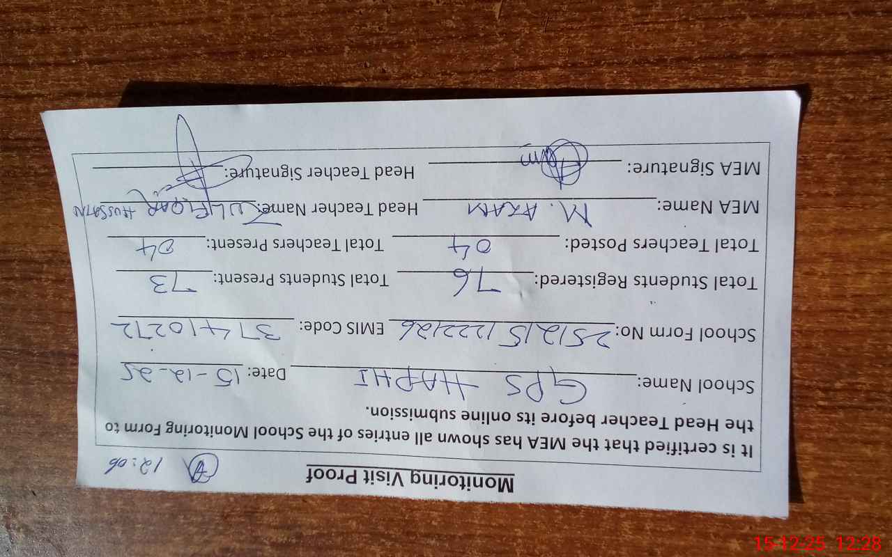 | Attendance Register | Head Teacher | MEA with School | Visit Proof |