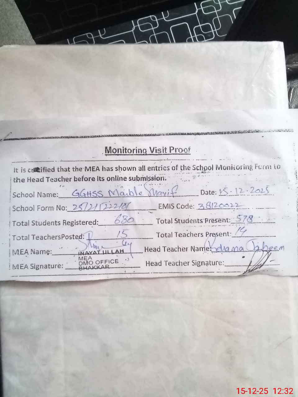 | Certified that this School was Inspected by the Undersigned MEA/DMO Today and the Information Stated Above is as Per Record. | |||||