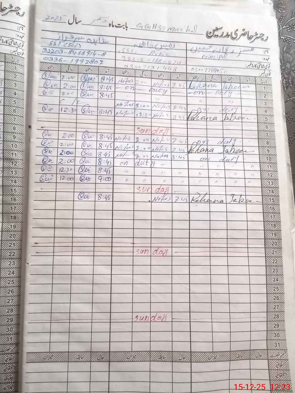 | CNIC | Full Name | Designation | R/C | Absence During Last Calender Month |