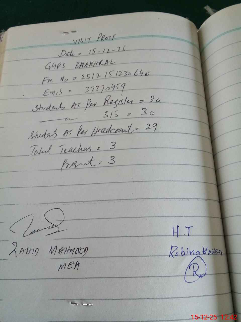 | Attendance Register | Head Teacher | MEA with School | Visit Proof |