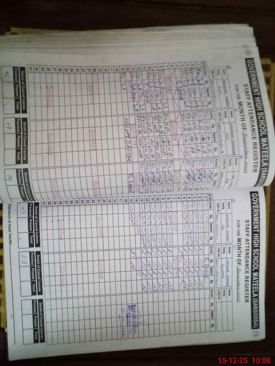 | CNIC | Full Name | Designation | R/C | Absence During Last Calender Month |