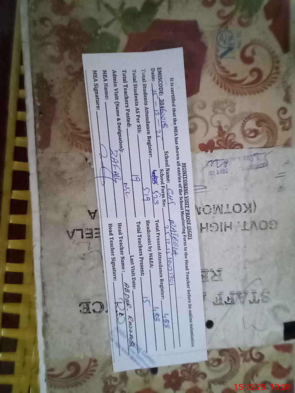 | Attendance Register | Head Teacher | MEA with School | Visit Proof |