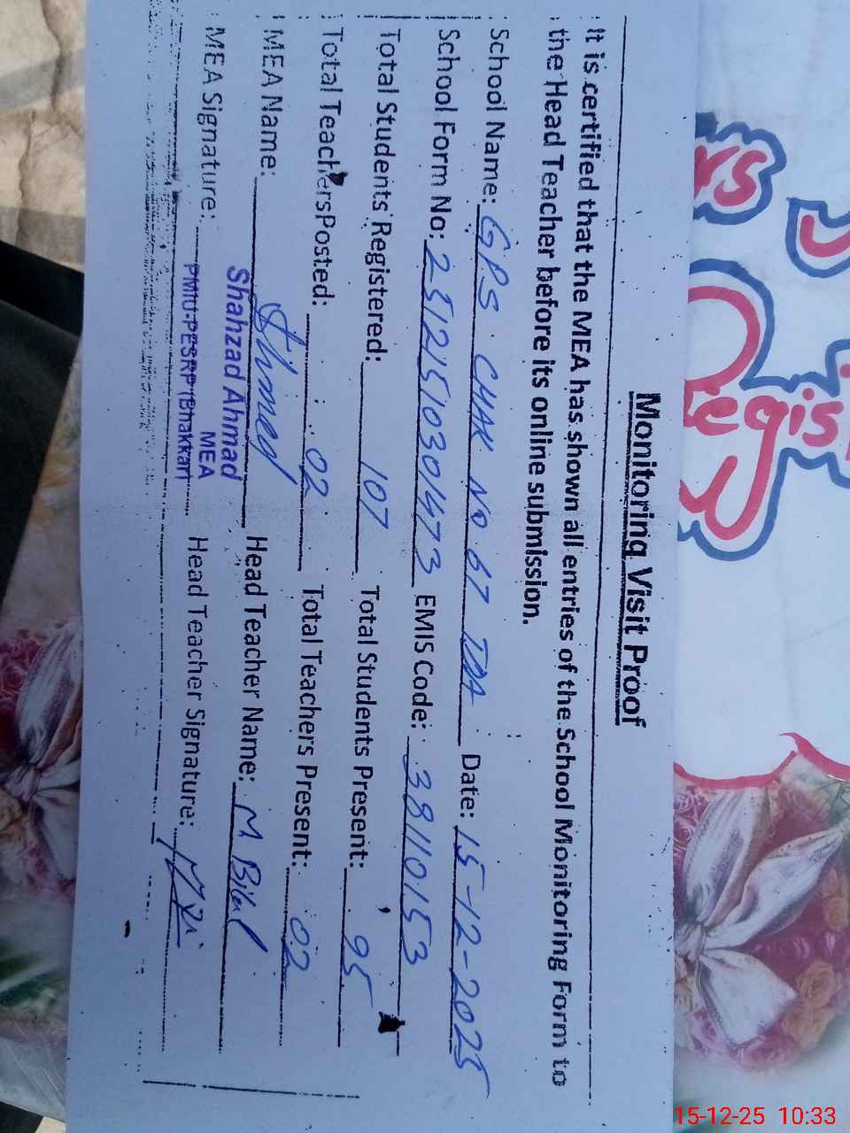 | Certified that this School was Inspected by the Undersigned MEA/DMO Today and the Information Stated Above is as Per Record. | |||||