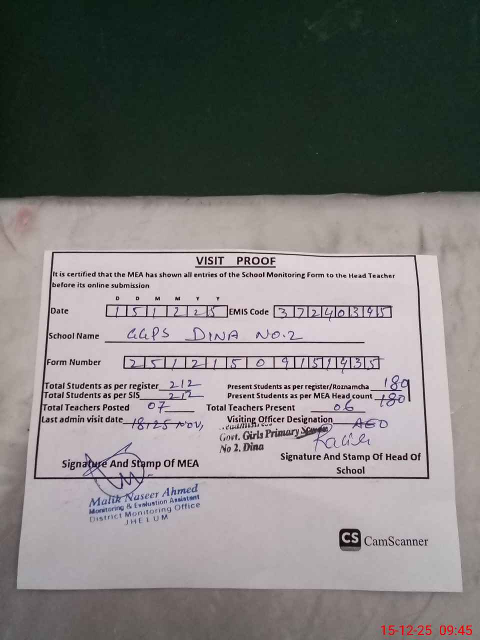 | District: JHELUM | Tehsil: DINA | Markaz: DINA - FEMALE | Level: Primary | |