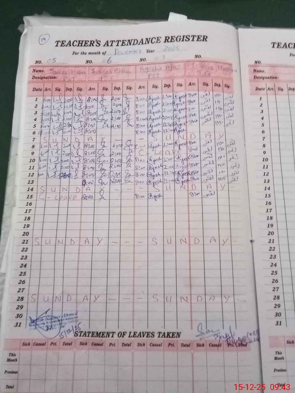 | Total no. of Classrooms: 4 No. of Classrooms Used for Teaching: 4 No. of Classrooms Storing Old Furniture, FTBs, etc: 0Comments if Any: Earned leave consider as casual leave |