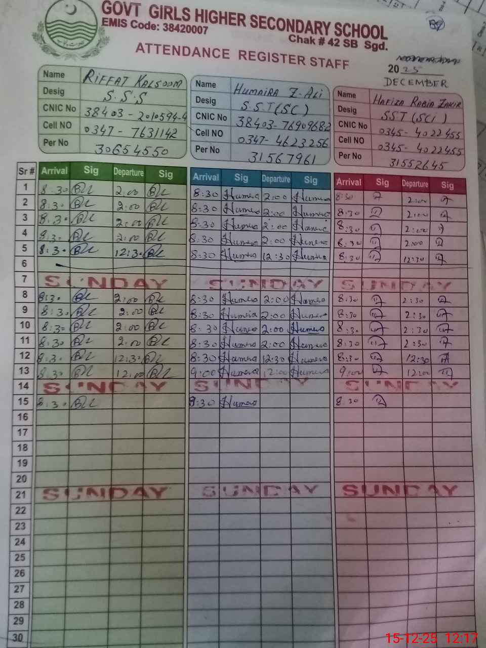 | CNIC | Full Name | Designation | R/C | Absence during last cal. month |