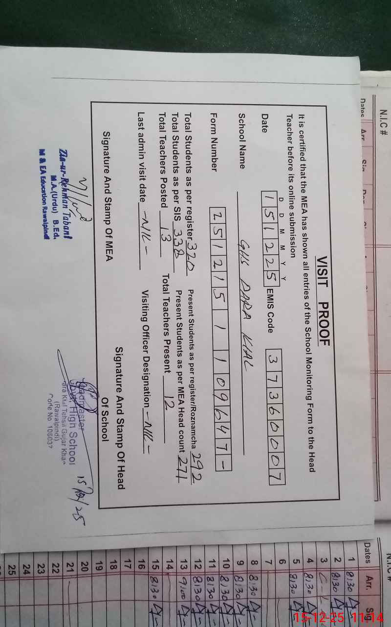 | Attendance Register | Head Teacher | MEA with School | Visit Proof |