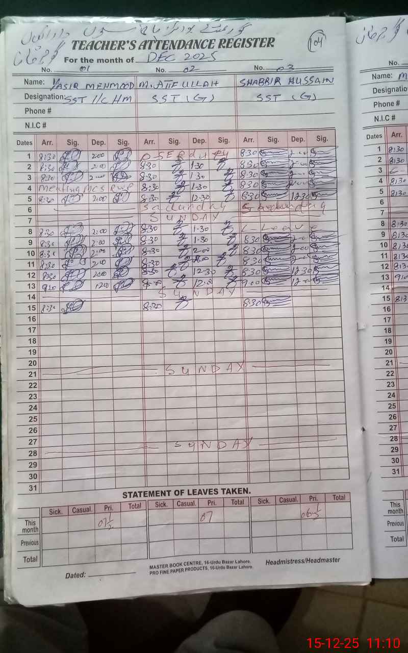 | CNIC | Full Name | Designation | R/C | Absence During Last Calender Month |