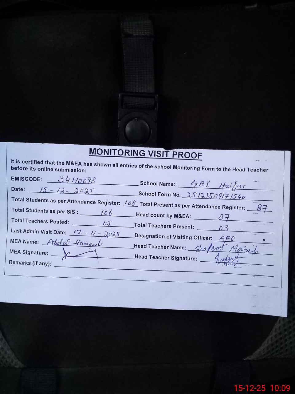 | Attendance Register | Head Teacher | MEA with School | Visit Proof |