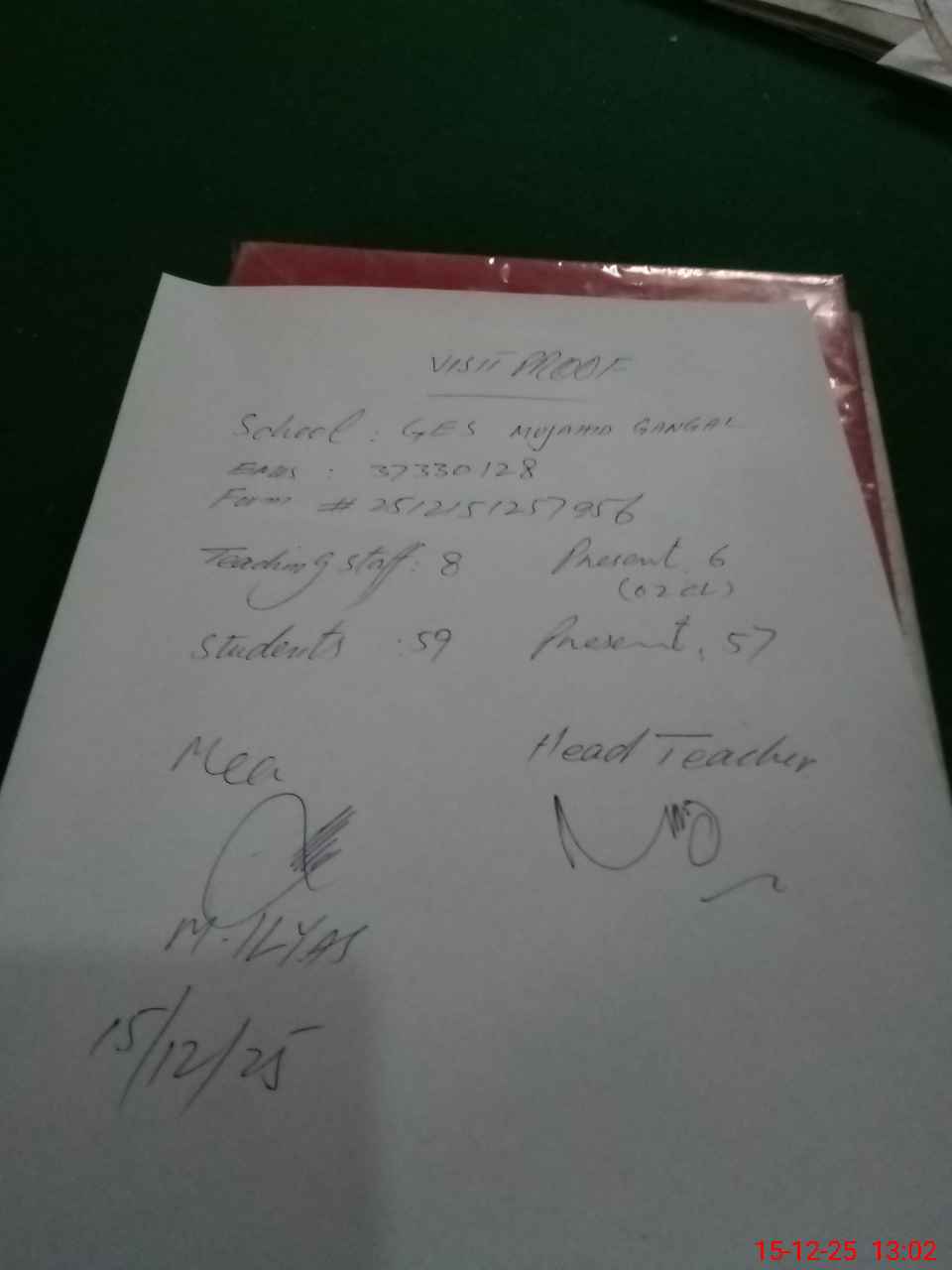 | Attendance Register | Head Teacher | MEA with School | Visit Proof |