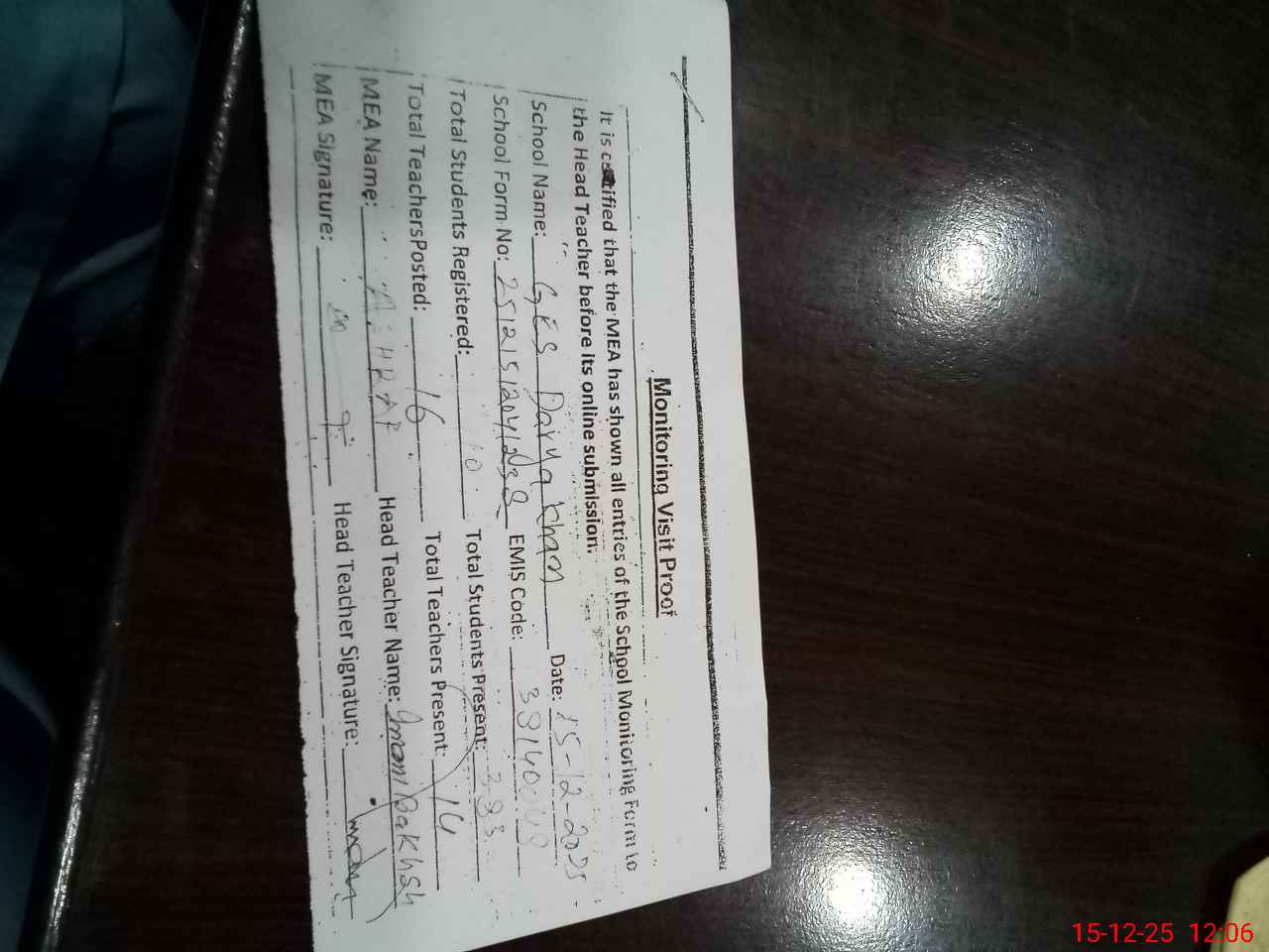 | Attendance Register | Head Teacher | MEA with School | Visit Proof |