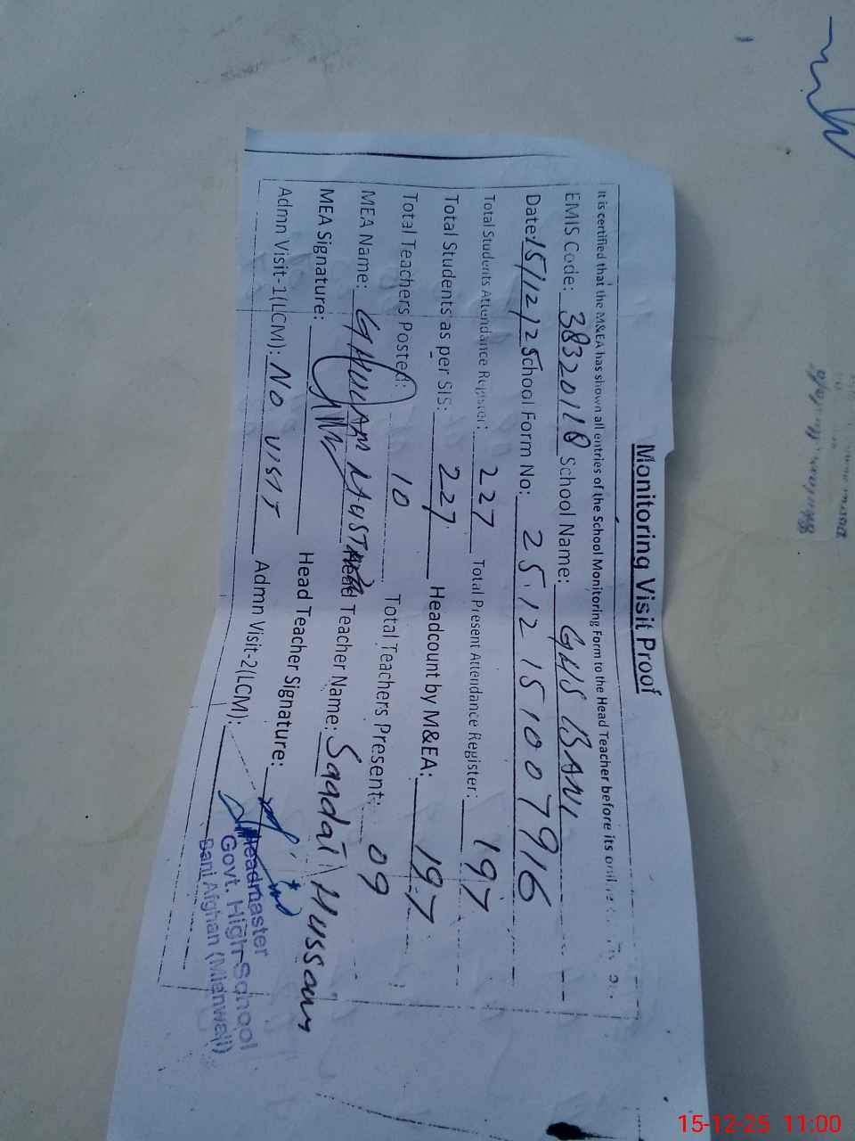 | Attendance Register | Head Teacher | MEA with School | Visit Proof |