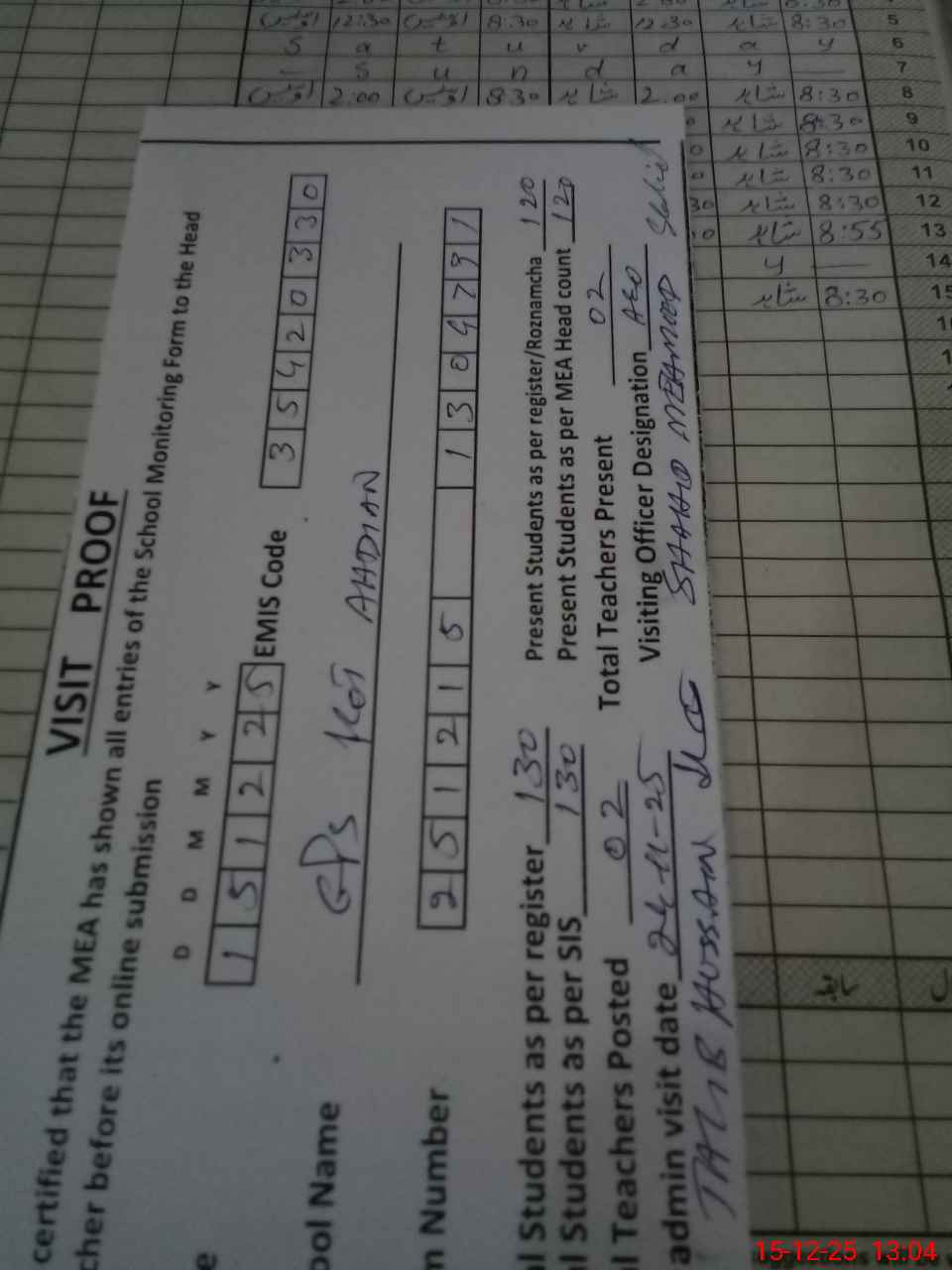 | Attendance Register | Head Teacher | MEA with School | Visit Proof |