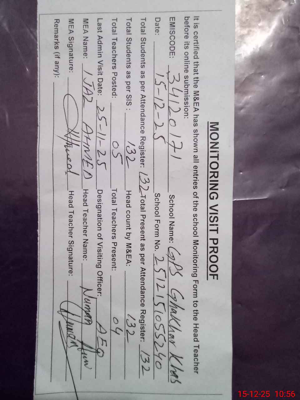 | Attendance Register | Head Teacher | MEA with School | Visit Proof |