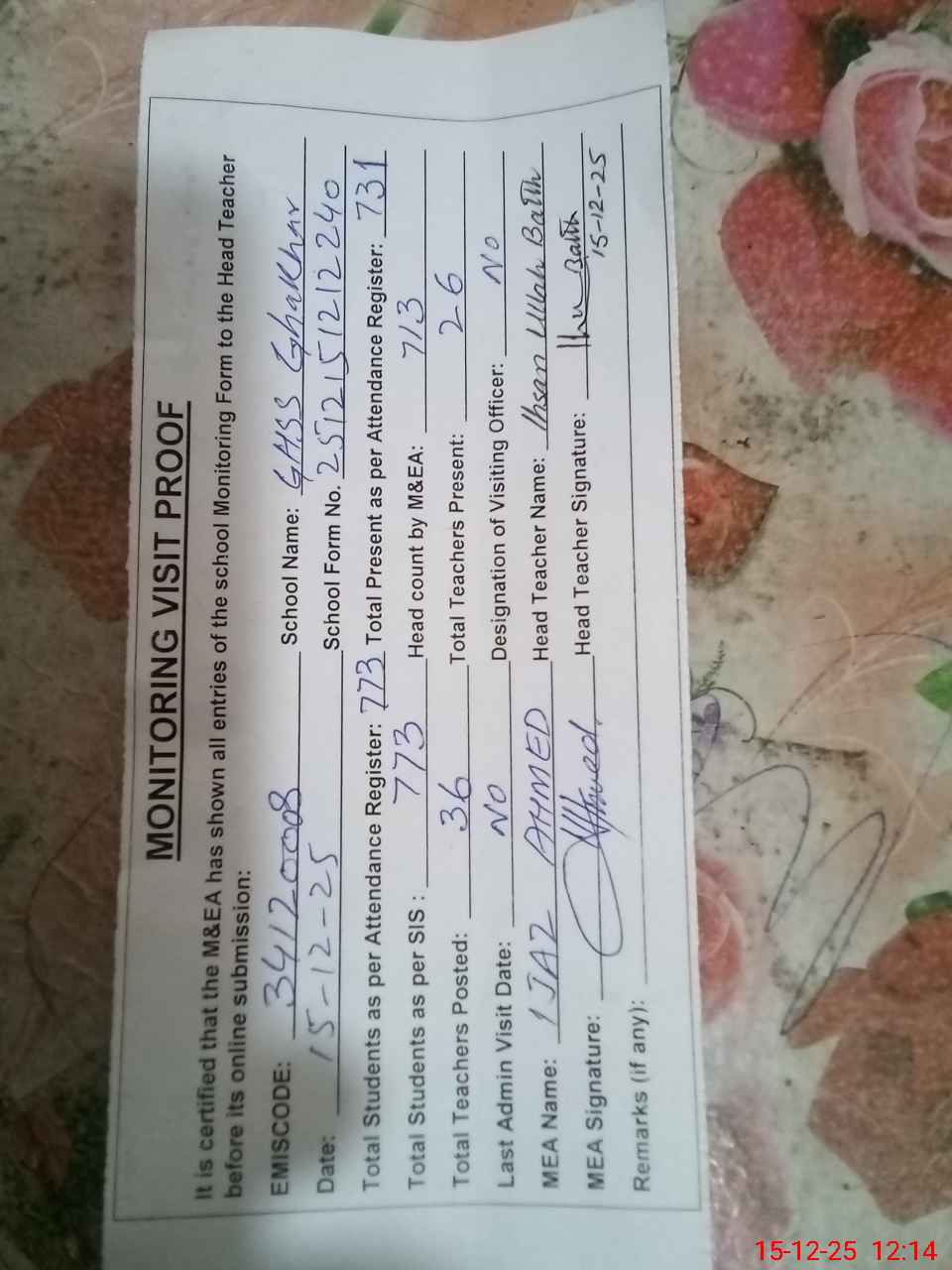 | EMIS Code: 34120008 | Name of School: GHSS GHAKHAR | |||
