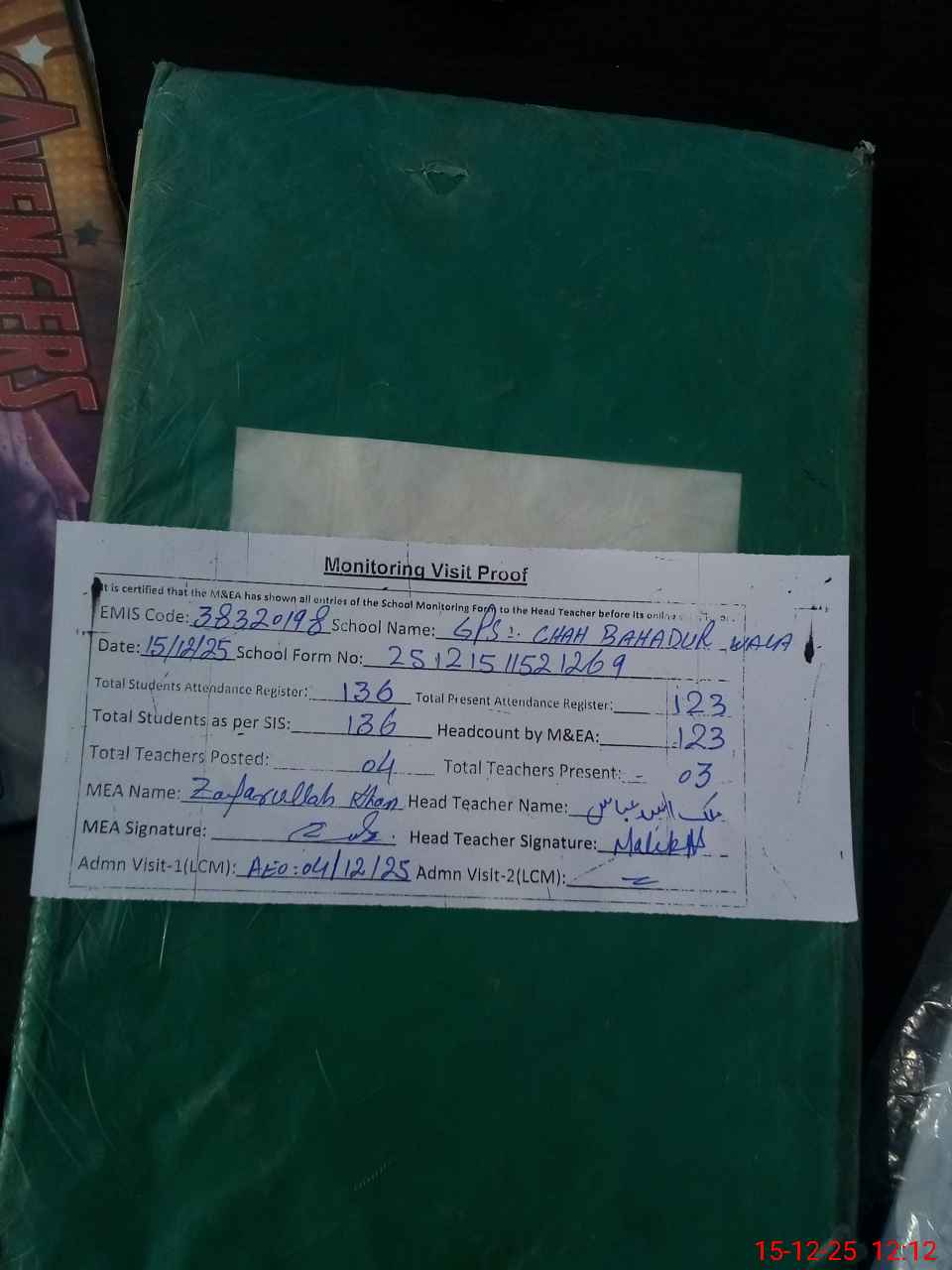| Attendance Register | Head Teacher | MEA with School | Visit Proof |