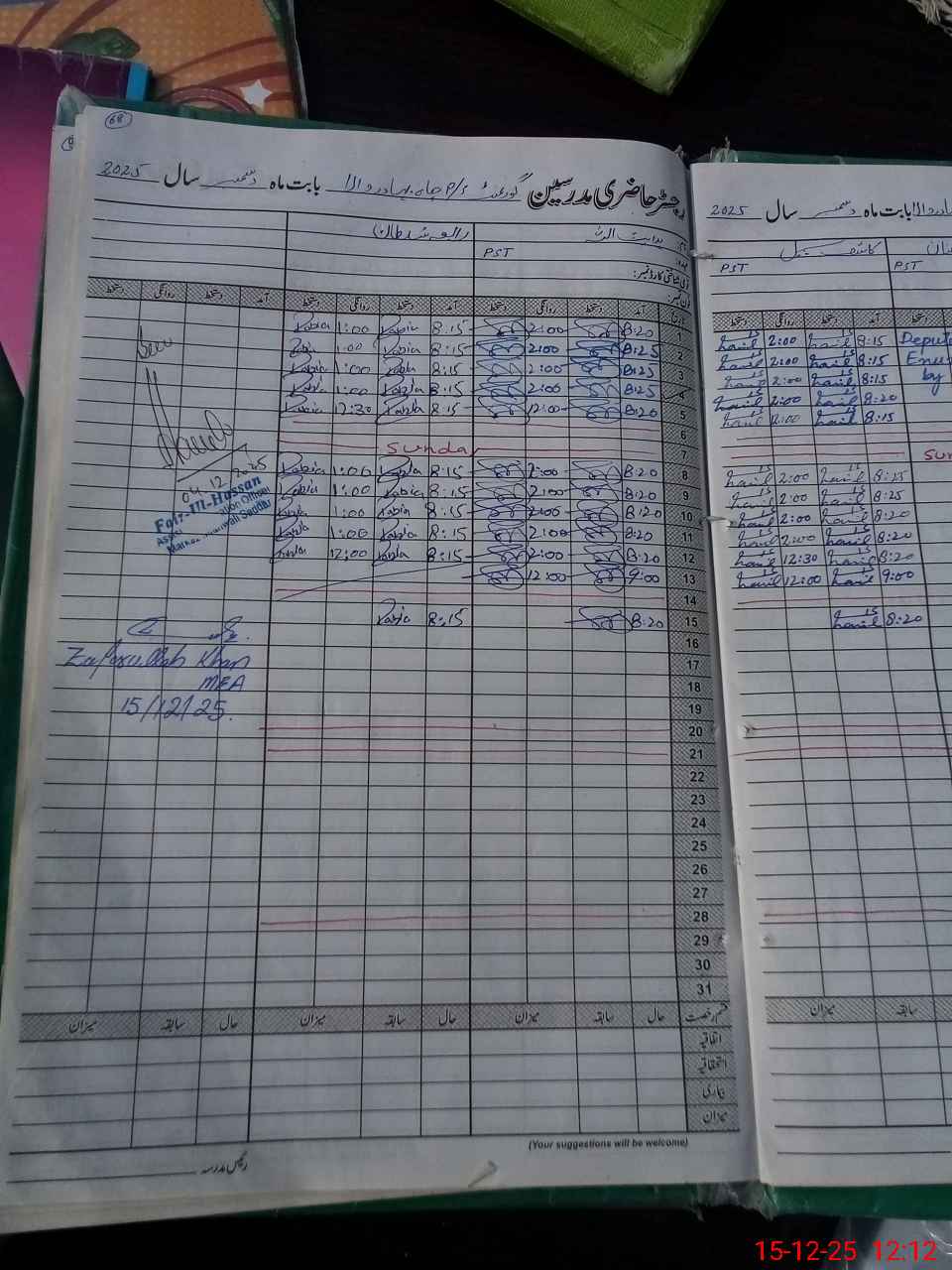 | Monitoring Date: 15-12-2025 | Start Time: 15-12-2025 11:49 AM | End Time: 15-12-2025 12:23 PM | Name of MEA: ZA**** UL**** KH**** | |