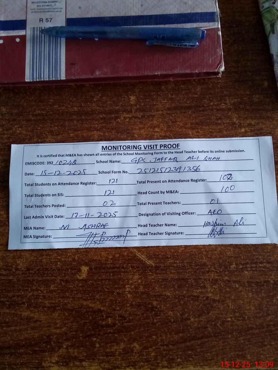 | Attendance Register | Head Teacher | MEA with School | Visit Proof |