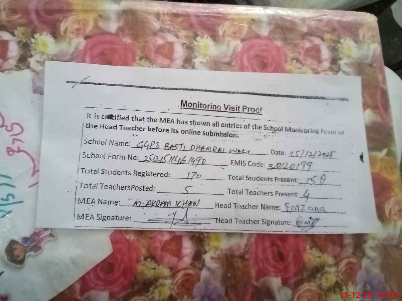 | Attendance Register | Head Teacher | MEA with School | Visit Proof |