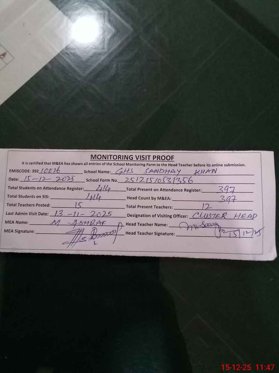 | Attendance Register | Head Teacher | MEA with School | Visit Proof |