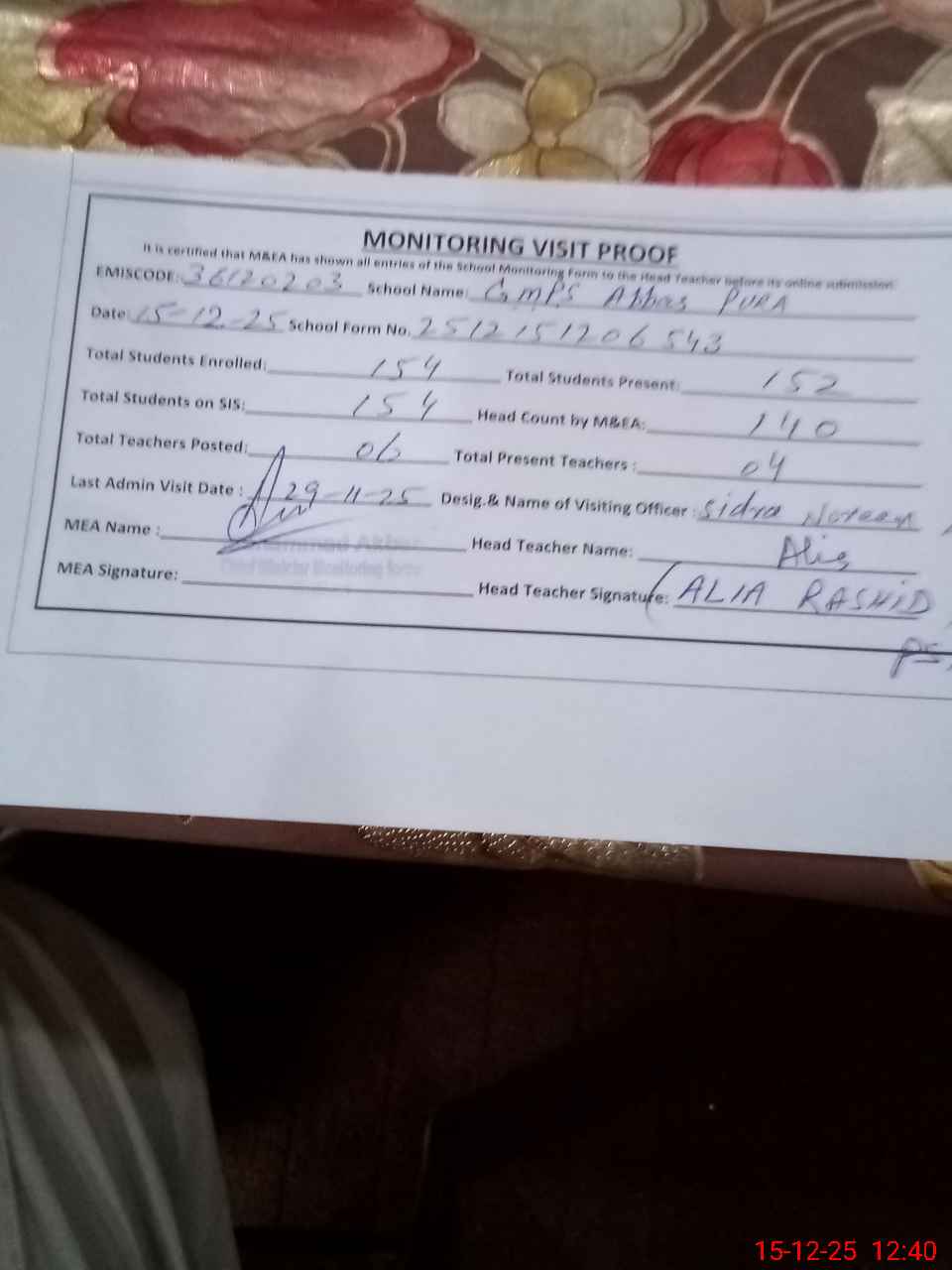| EMIS Code: 36120203 | Name of School: GMPS ABBAS PURA | |||