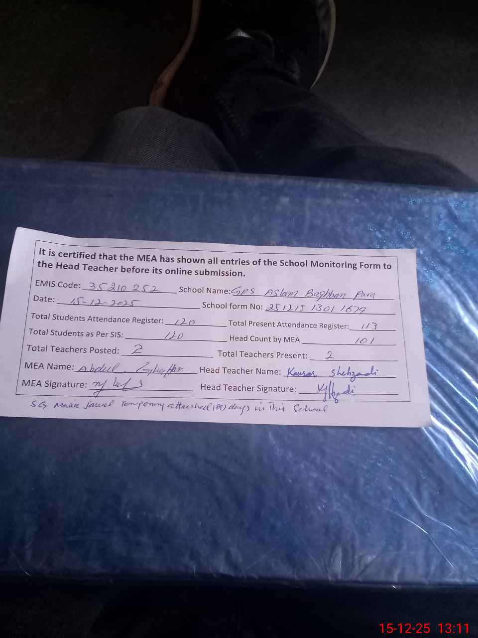 | Attendance Register | Head Teacher | MEA with School | Visit Proof |