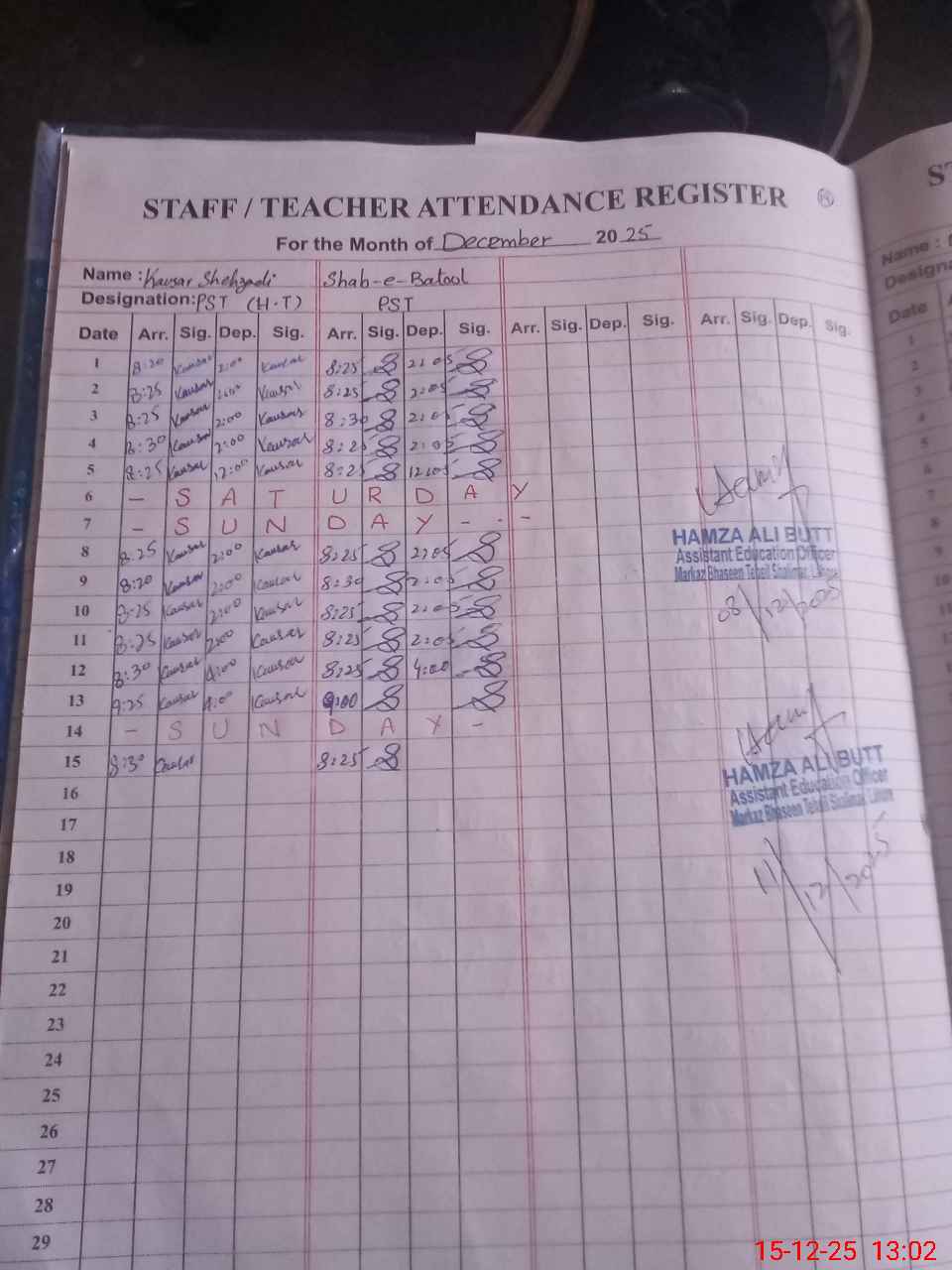 | CNIC | Full Name | Designation | R/C | Absence During Last Calender Month |