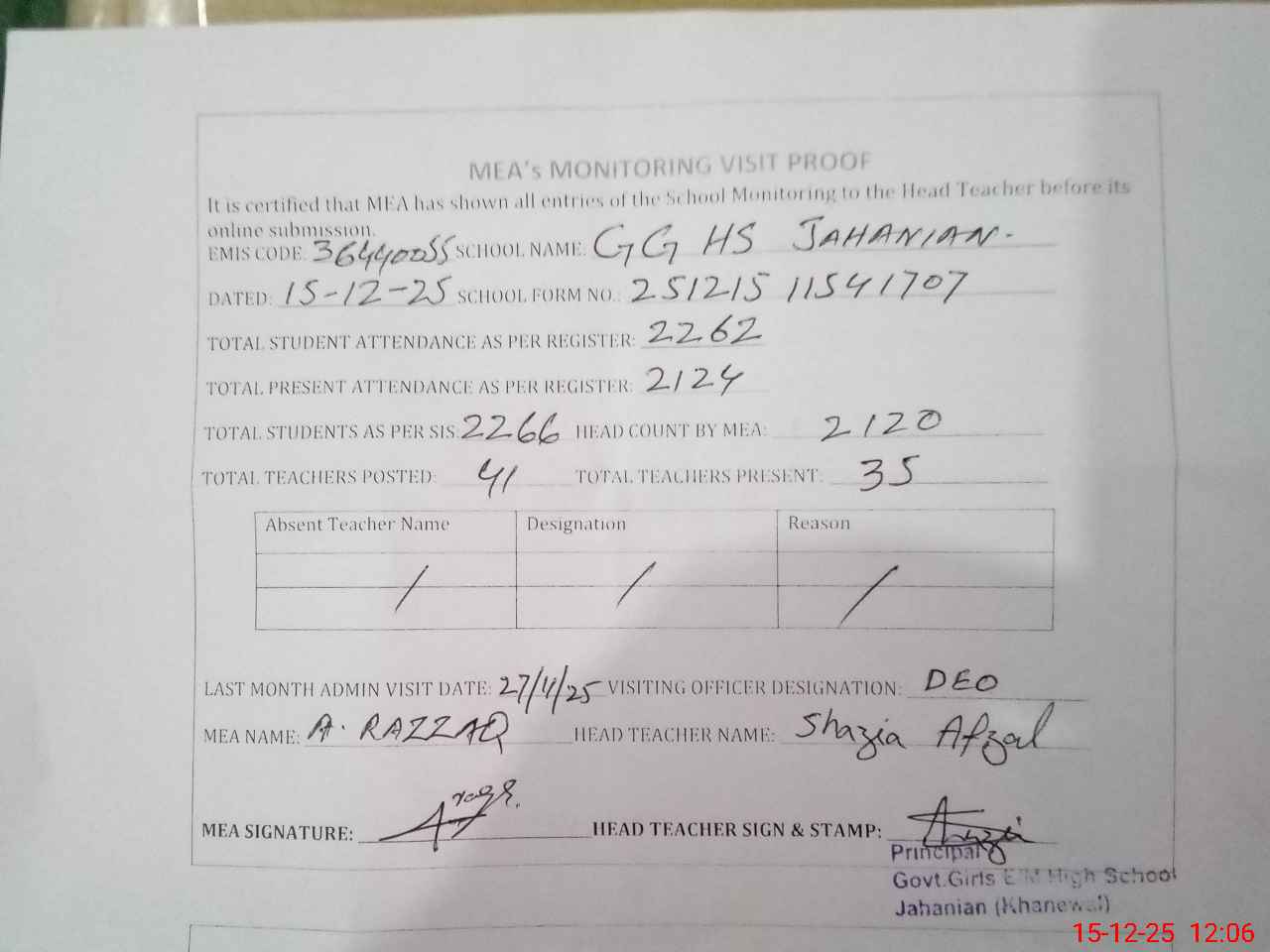 | Attendance Register | Head Teacher | MEA with School | Visit Proof |