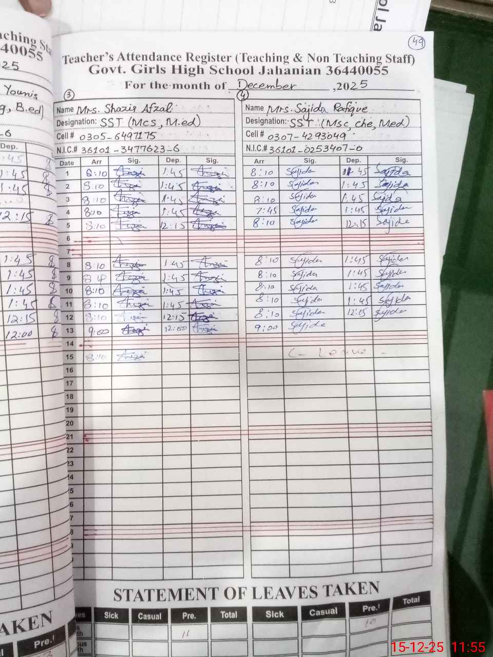 | CNIC | Full Name | Designation | R/C | Absence During Last Calender Month |