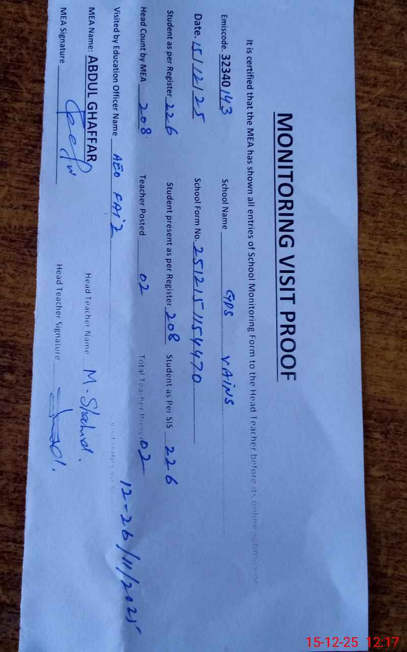 | Attendance Register | Head Teacher | MEA with School | Visit Proof |