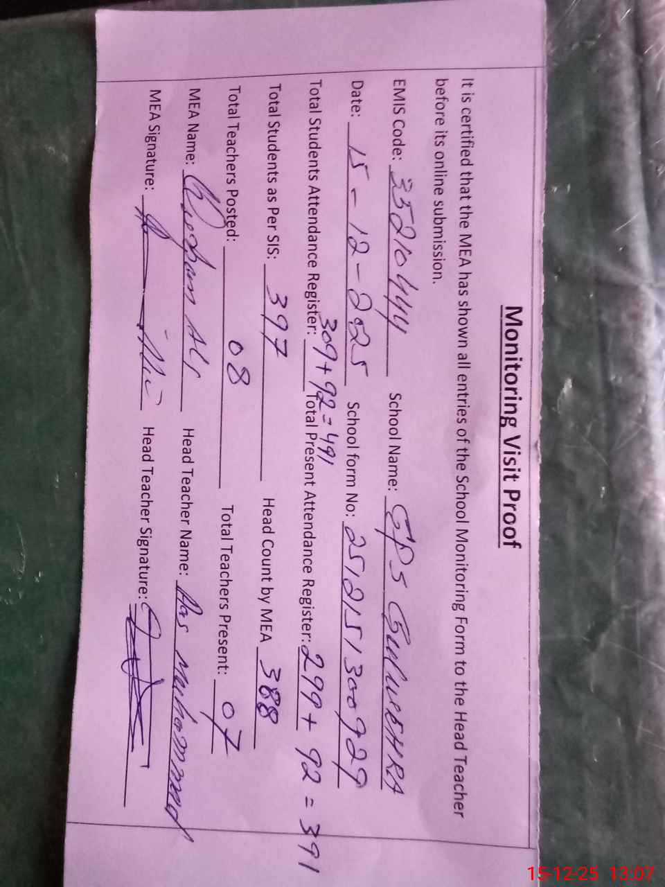 | Remarks (Use Separate Page if Required): Administrator visit of Assistant Education Officer on 10th November 2025 /17th November 2025 but DY DEO visit not available in 2025. The school boundary wall fall down Estimated 100 feet but not repaired from the previous two months . The school have two buildings also performed the duty in two buildings. | |||||