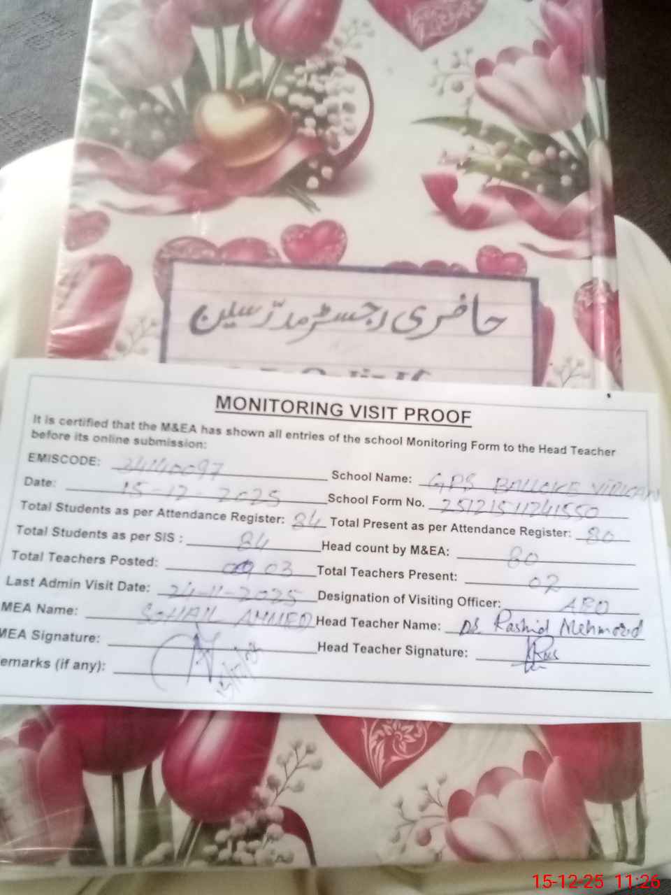 | Attendance Register | Head Teacher | MEA with School | Visit Proof |