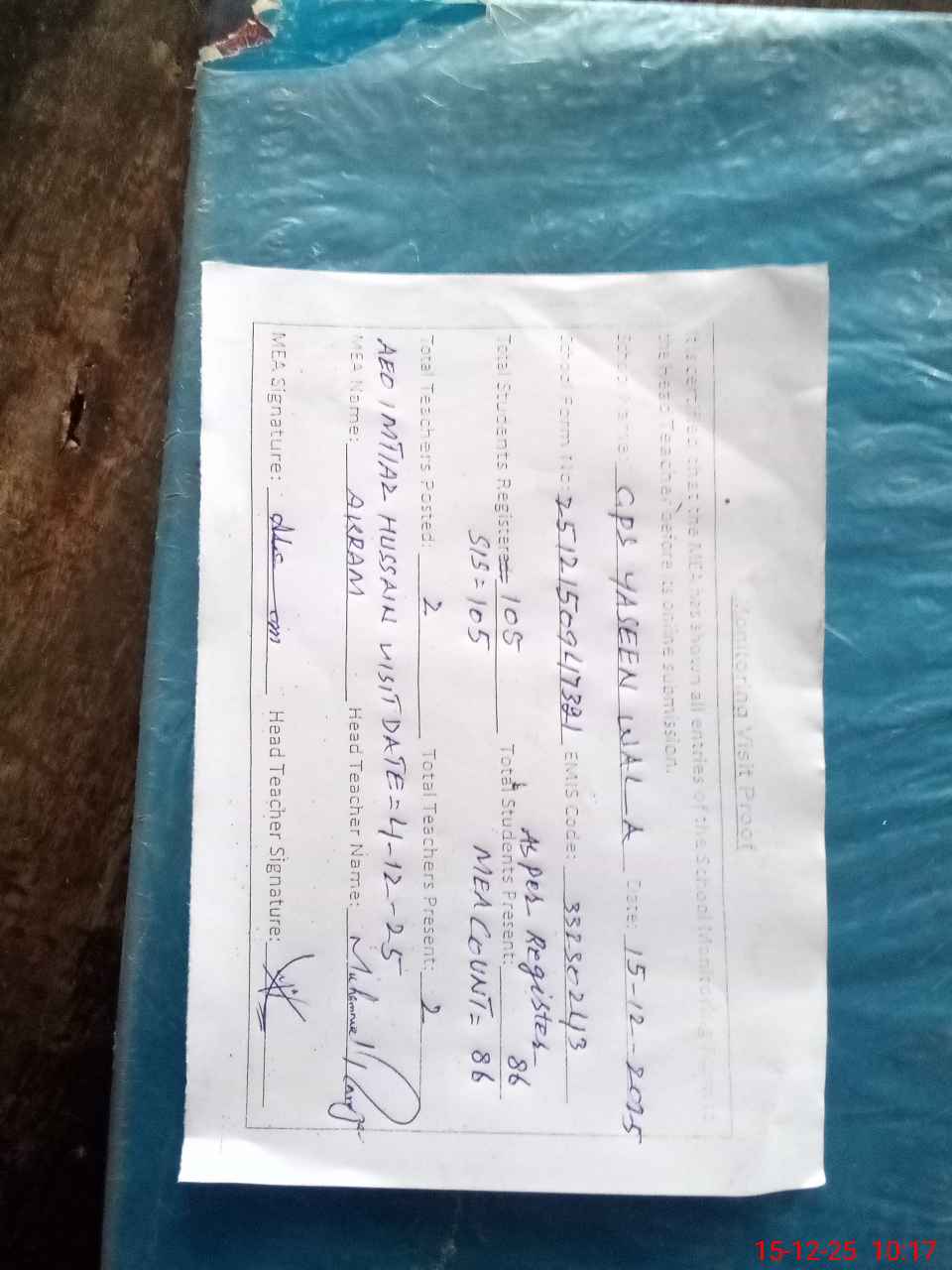 | EMIS Code: 33230243 | Name of School: GPS YASEEN WALA | |||