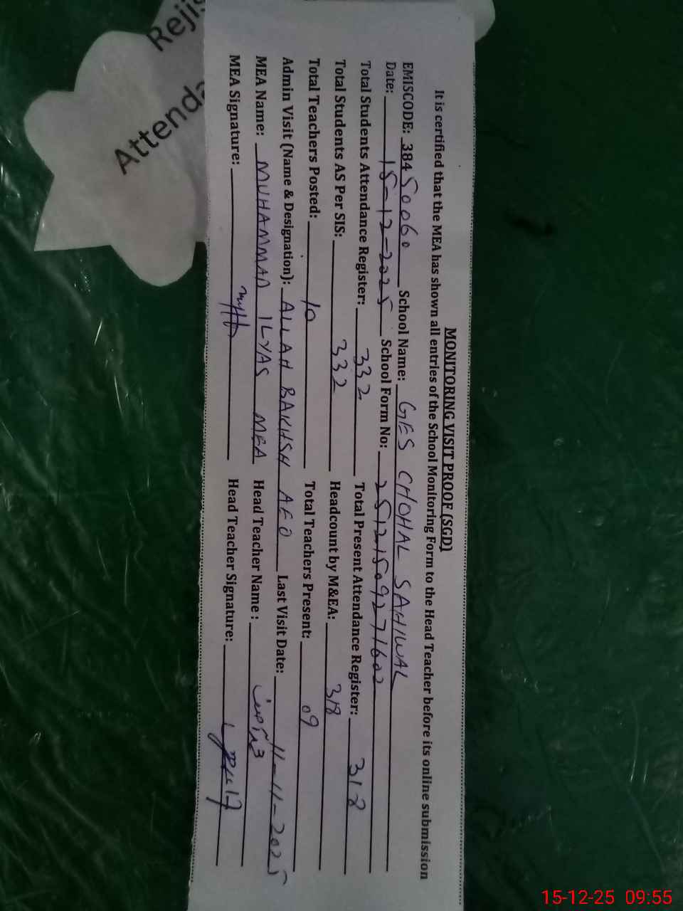 | EMIS Code: 38450060 | Name of School: GES CHOHAL SAHIWAL | |||