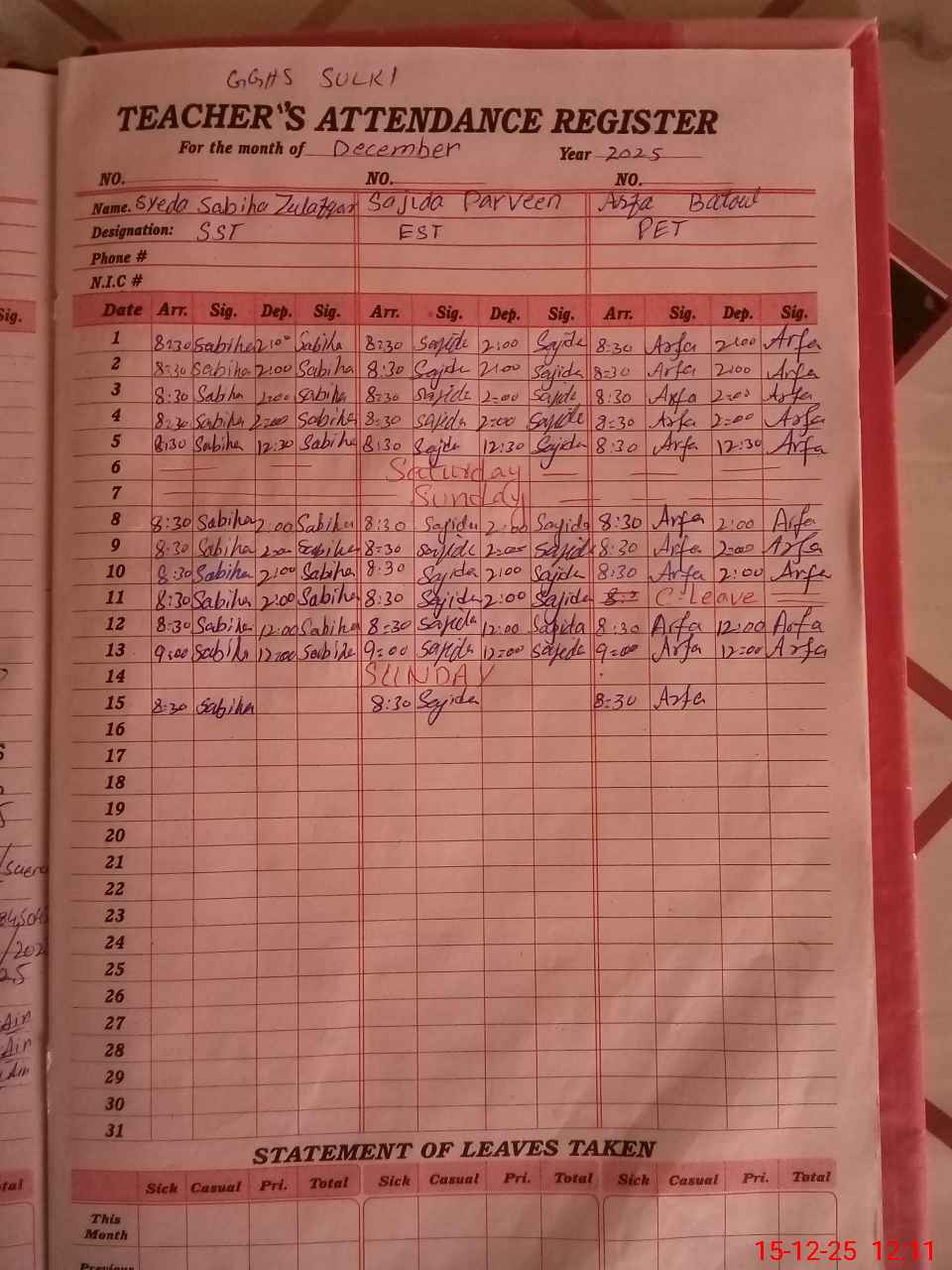 | CNIC | Full Name | Designation | R/C | Absence During Last Calender Month |