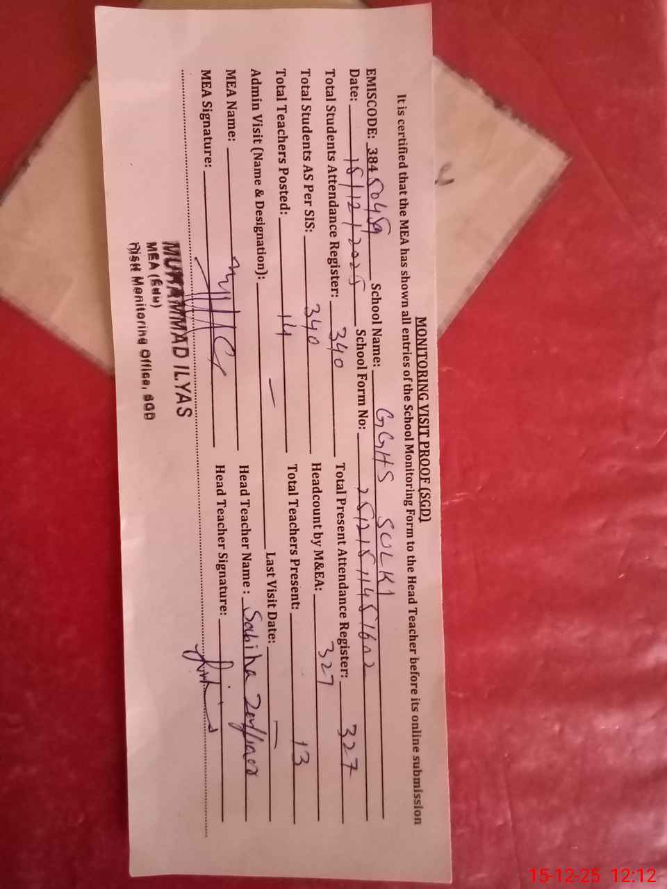 | Attendance Register | Head Teacher | MEA with School | Visit Proof |