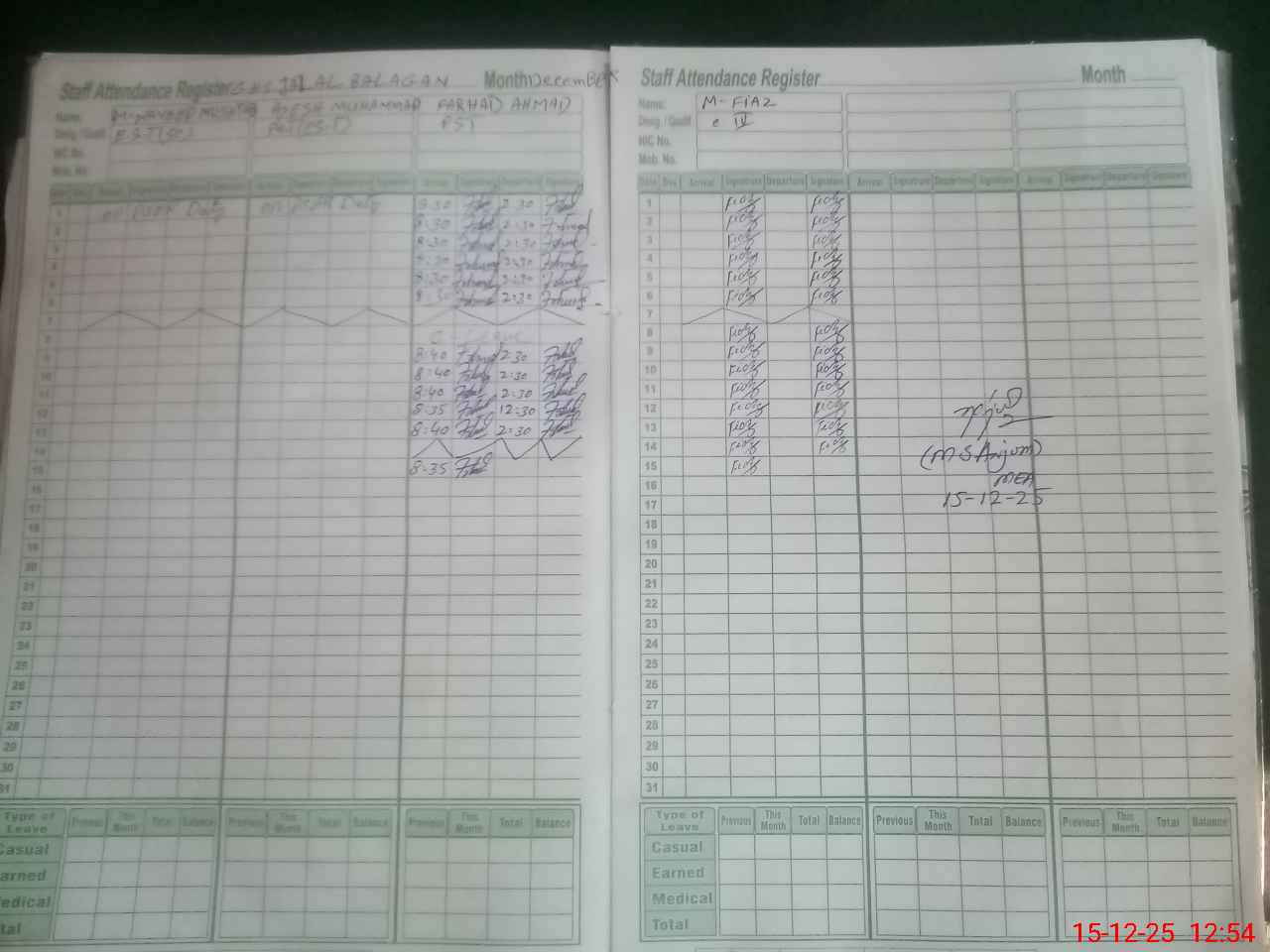 | CNIC | Full Name | Designation | R/C | Absence During Last Calender Month |
