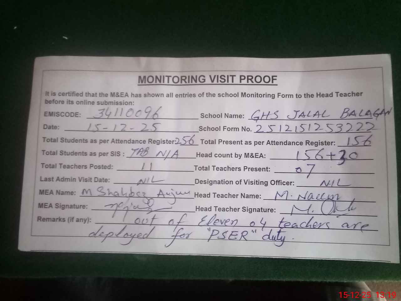 | EMIS Code: 34110096 | Name of School: GHS JALAL BALAGGAN | |||
