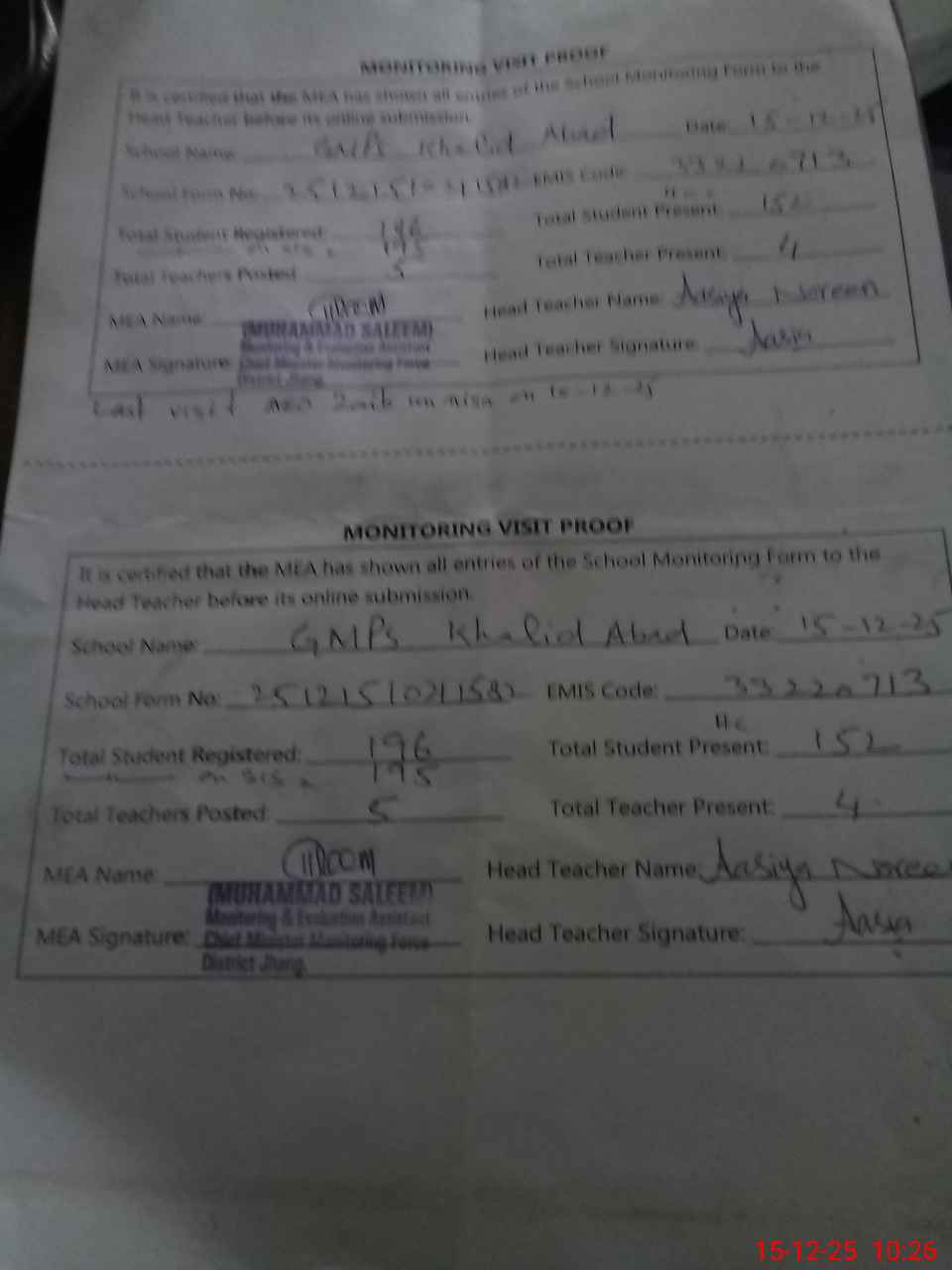 | EMIS Code: 33220713 | Name of School: GMPS KHALID ABAD | |||