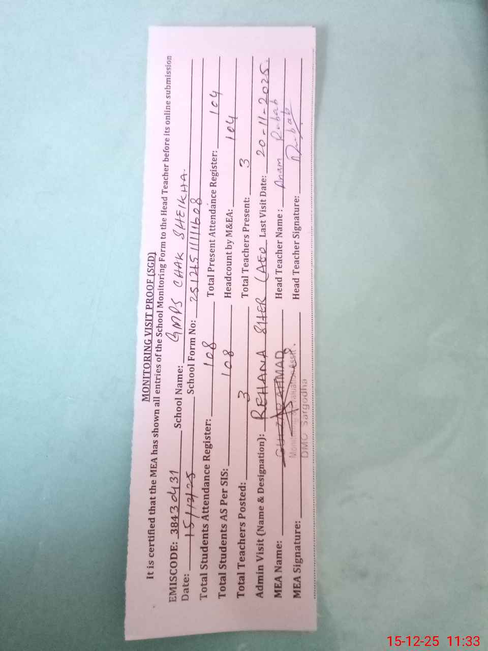 | Attendance Register | Head Teacher | MEA with School | Visit Proof |